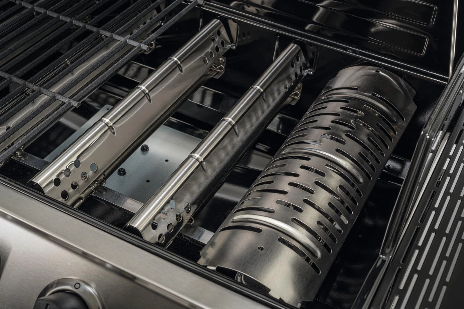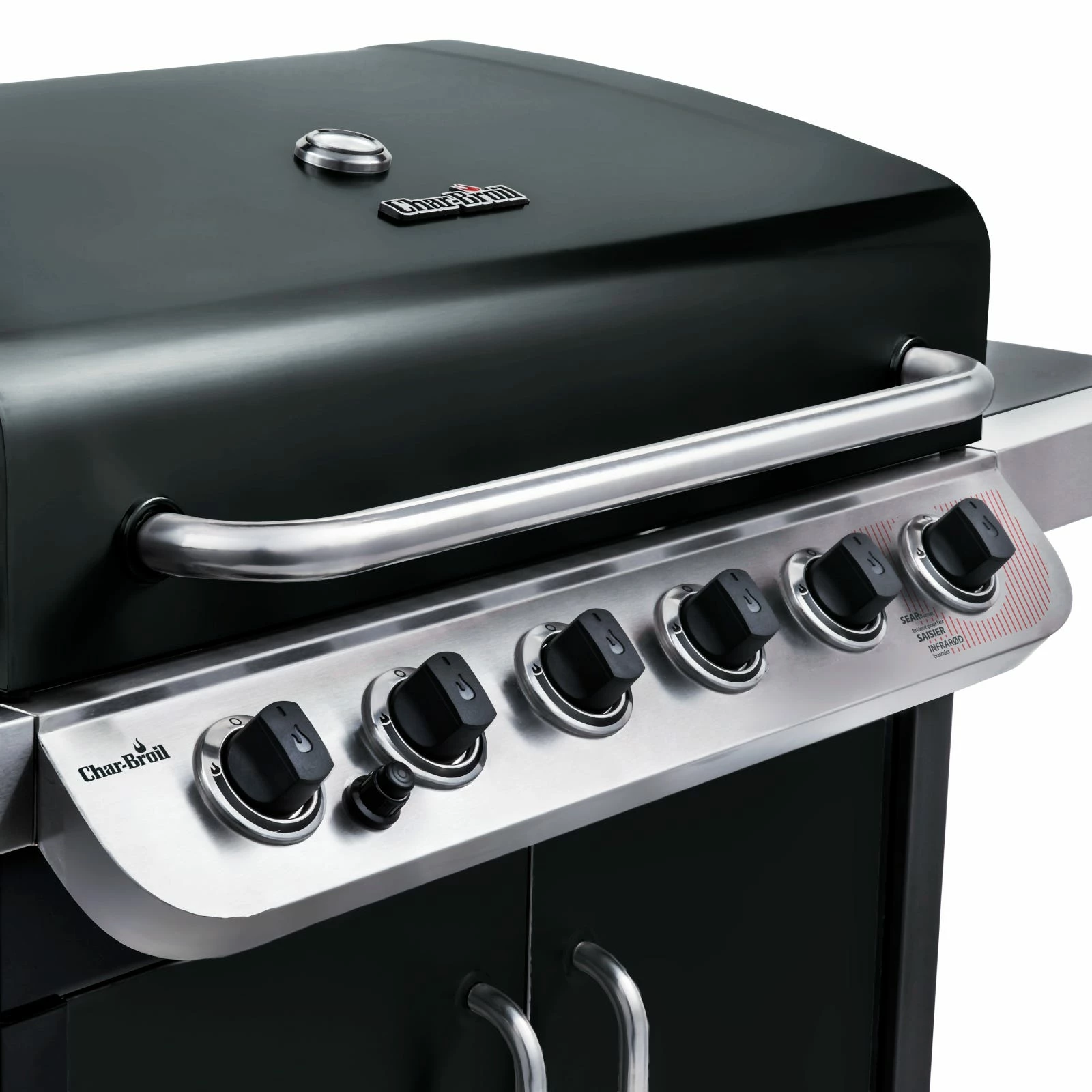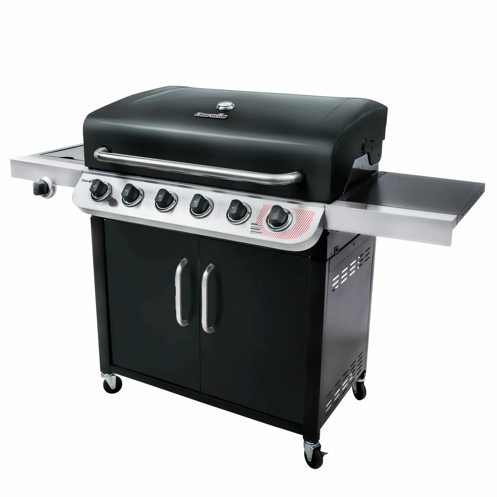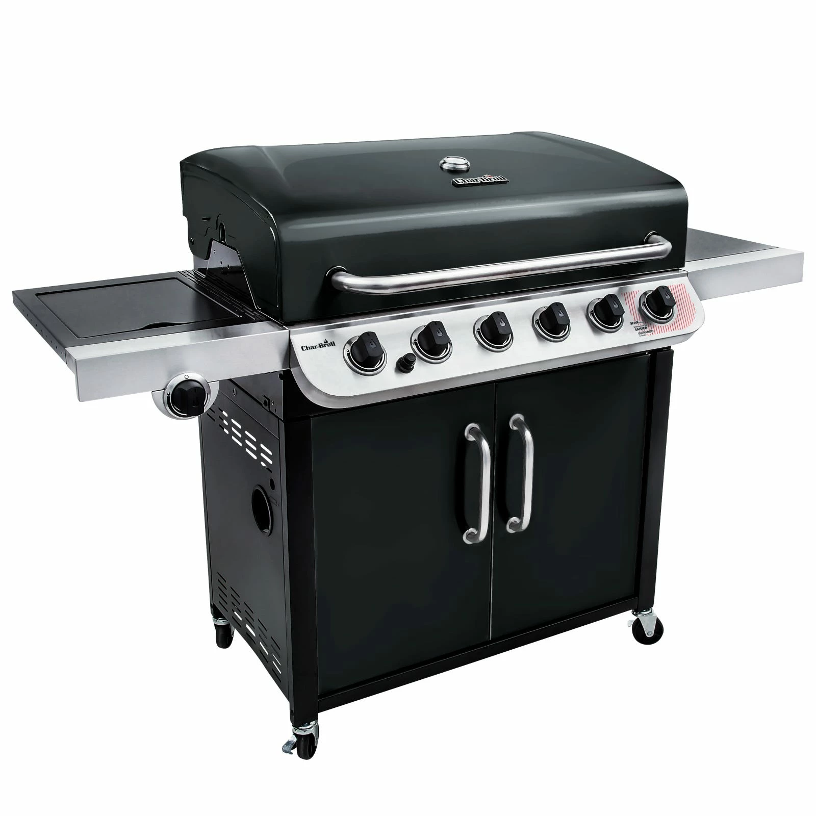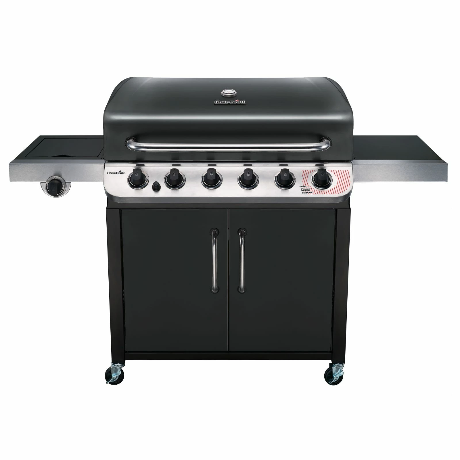 The Convective 6-burner grill features a modern stainless steel cabinet design with doors and the stainless steel burners emit flame from the top for even cooking and added durability. With the integrated sear burner very high temperatures can be reached within minutes. This grill is made to last, with cast iron grates for perfect sear marks and easy cleaning. All the features are here, including a removable porcelain-coated grease pan, a side burner and an electronic ignite.